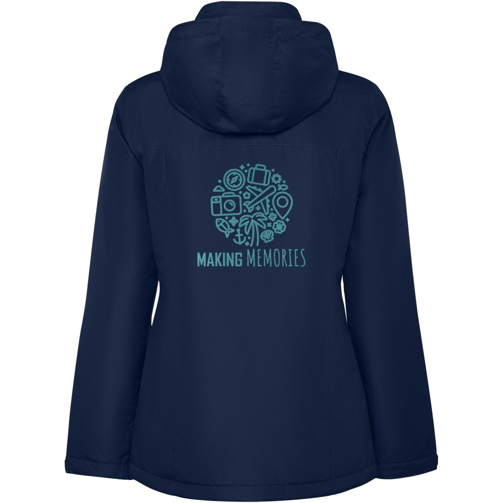 Vízálló bélelt parka nőknek. Karcsúsított fazon. Magas gallérral és levehető kapucnival, tépőzáras záródással. Oldalsó zsebek cipzárral, belső zseb tépőzáras záródással. Állítható mandzsetták tépőzáras övhurkokkal. Belső hozzáférés a hátsó és a bal mellkasi megerősítésekhez.