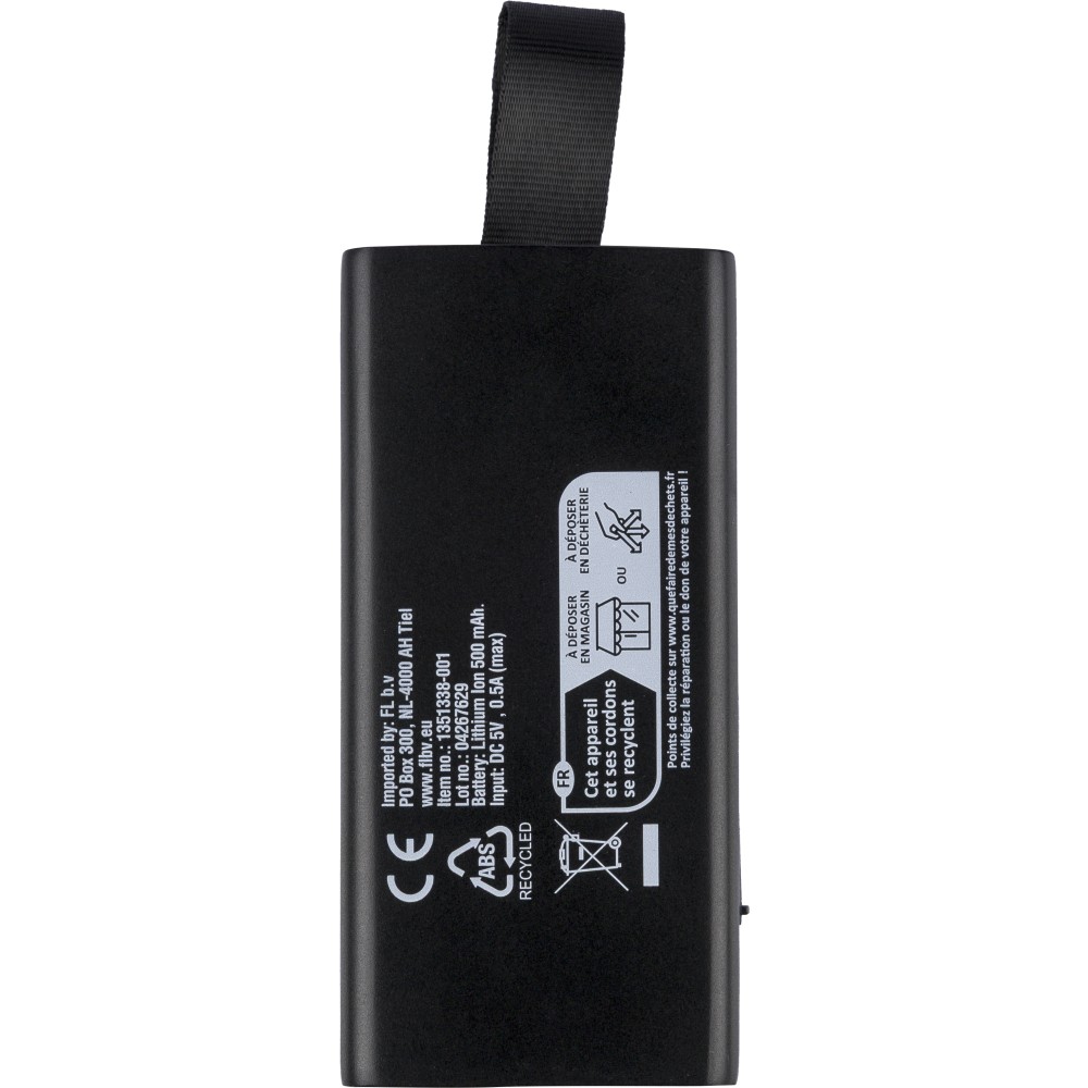 Újrahasznosított ABS-ből készült 5W teljesítményű hangszóró COB LED zseblámpával, szilikon hurokkal és 5.4-es vezeték nélküli technológiával. 500 mAh kapacitású akkumulátorral rendelkezik, 5V/500 mA bemenettel. Kültéri kialakítású, a terméktesten recycled (újrahasznosított) alapanyagra utaló logó található. Barna dobozba csomagolva.