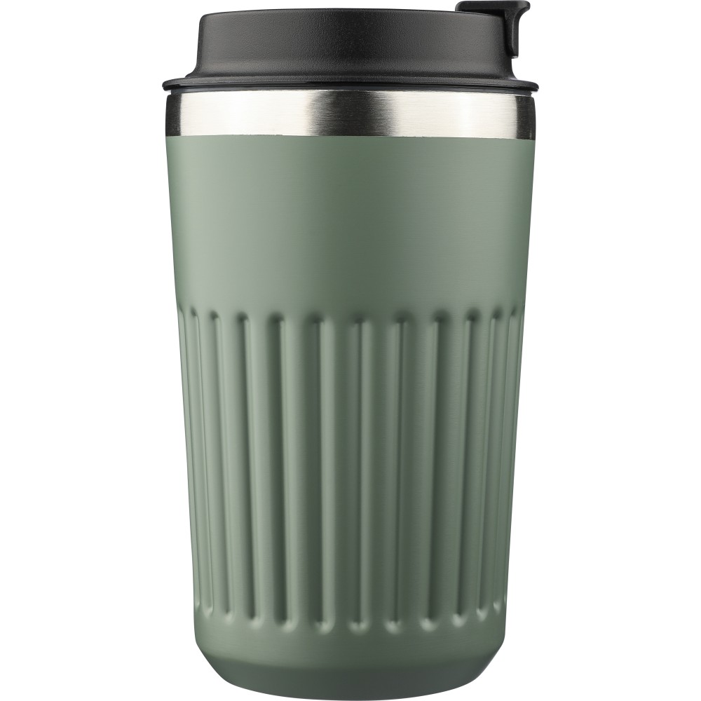 Újrahasznosított rozsdamentes acélból készült utazópohár 400 ml űrtartalommal, duplafalú kialakítással és külső bordázott felülettel. Belső része 304-es, külső része 201-es rozsdamentes acél, PP fedéllel. A pohártesten gravírozott recycled (újrahasznosított) alapanyagra utaló logó található. Darabonként barna kartondobozba csomagolva.