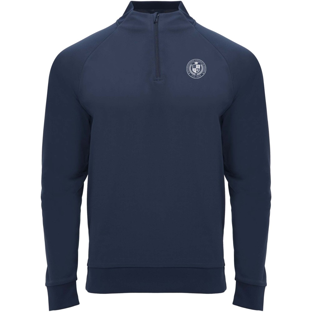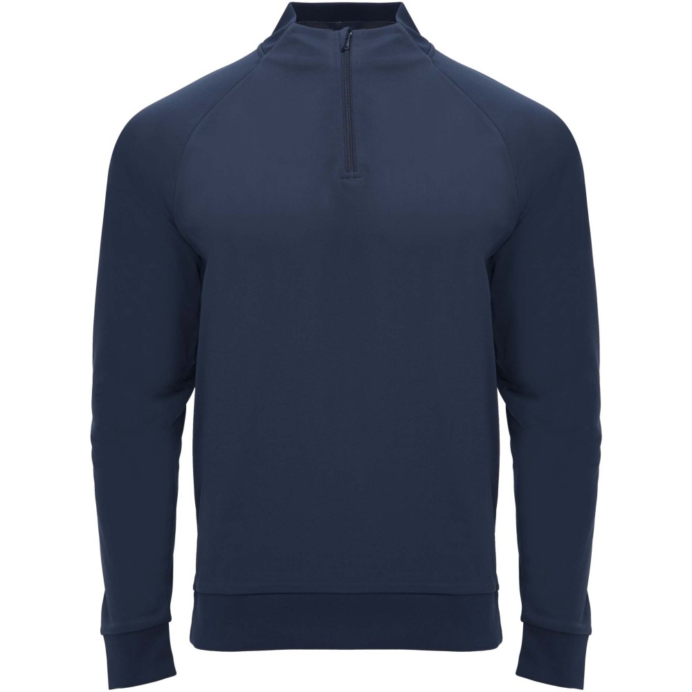 Technikai anyag. Raglán ujjak. Belül bolyhos anyag. Negyedcipzár azonos színű megerősített, fedett öltésekkel. Bordázott nyak-, ujj- és aljpasszé. Eltávolítható címke.