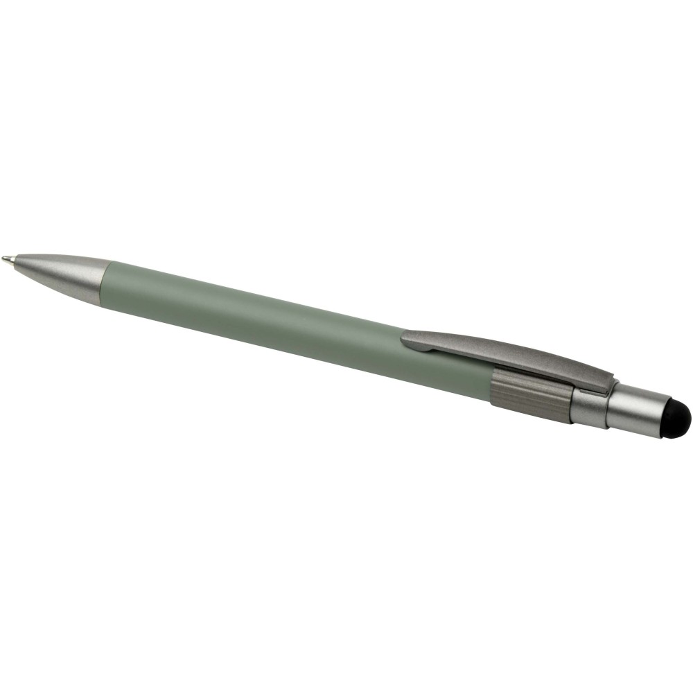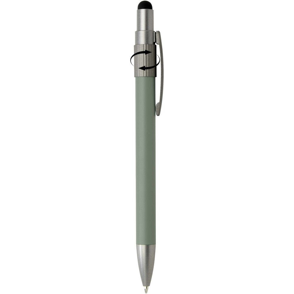 Golyóstoll érintővéggel és fidget spinnerrel, amely a praktikumot játékos dizájnnal ötvözi. A toll RCS tanúsítvánnyal rendelkező újrahasznosított alumíniumból készült, sima működésű nyomógombos szerkezettel és az érintőképernyőkhöz használható érintővéggel rendelkezik. A toll tetején a fidget spinner kiváló stresszoldó. Fekete tollbetéttel, íráshossza 1000 méter.