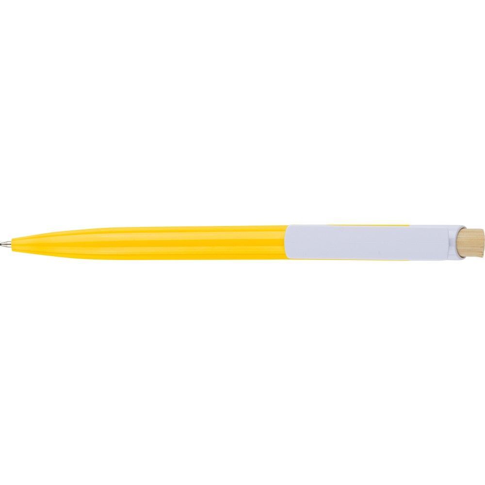 Újrahasznosított ABS-ből készült golyóstoll bambusz nyomógombbal és fehér klippel, digitális nyomtatásra alkalmas kivitelben. A tolltesten fröccsöntés során elhelyezett recycled (újrahasznosított) alapanyagra utaló logó található. Megközelítőleg 600 méter íráshosszúságú, kék színű tollbetéttel.