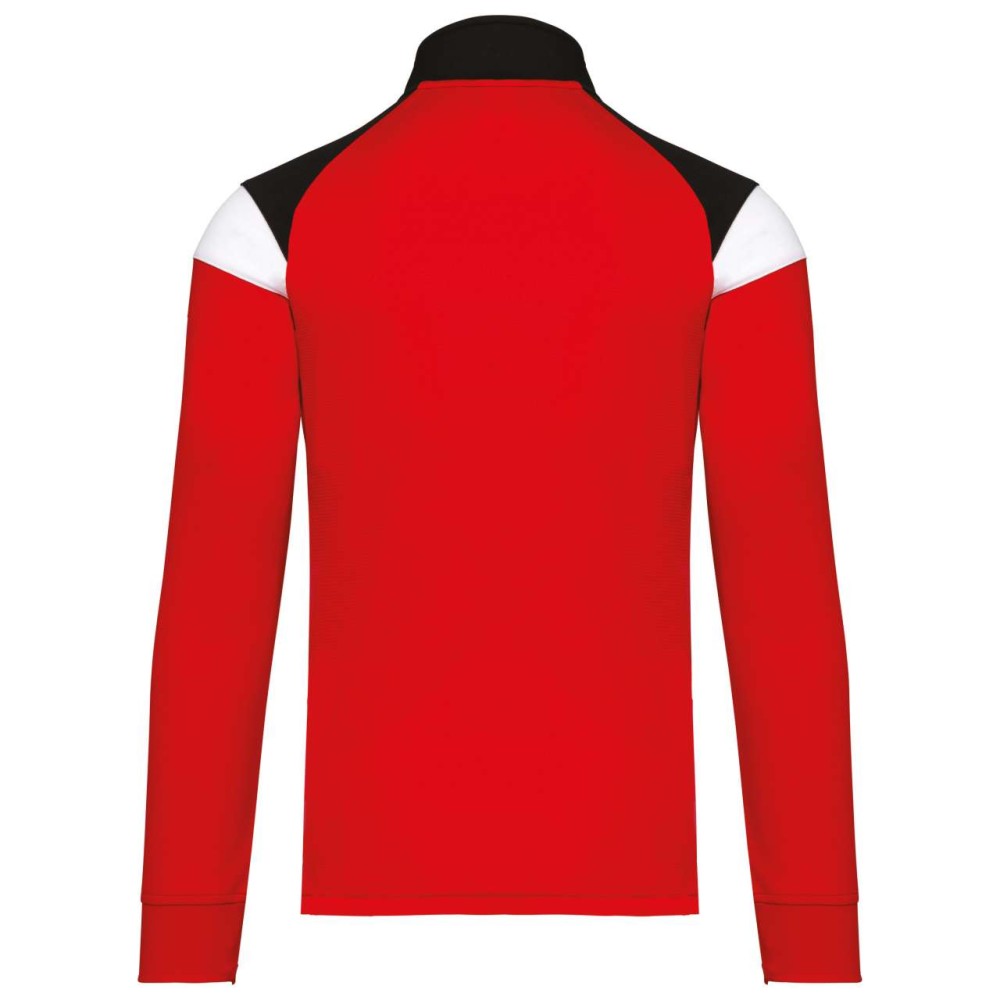 Anyaga: 100% matt poliészter interlock. Egyenes szabás. Elöl fordított cipzáras záródás színazonos nejlonból. Raglán ujjak kontrasztos vállbetétekkel. Kontrasztos mell- és vállkialakítás. Két cipzáras elülső zseb. Texturált anyagbetétek az oldalakon és a hátrészen. Cipzárfedő a felső nyakkivágásnál a nagyobb kényelem érdekében. Könnyen eltávolítható márkajelzés a dekorációhoz.